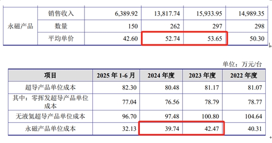 更扎心的是,健信超导这不足25%的毛利率还可能是以牺牲业绩换来的。2024年健信超导主营业务收入同比下滑4.93%,其中永磁产品销售收入下降2116.21万元,直接影响业绩。公司解释称永磁产品收入下滑是受磁钢原材料价格回落影响,但实际是公司策略选择所致。2023和2024年,公司永磁产品销售价格分别为53.65万元/台、52.74万元/台,2024年同比下降1.7%;同期,该产品单位成本分别为42.47万元/台、39.74万元/台,2024年同比下降6.43%。受销售价格降幅小于单位成本影响,2024年永磁产品毛利率较前一年提高3.81个百分点至24.65%。永磁产品盈利增厚意味着价格竞争力下降,部分客户转向其他供应商也就不足为奇。因此,2024年永磁产品销售收入下滑,表面看起来是受磁钢原材料价格回落影响,实际上是公司为了提升毛利率的主动选择。健信超导为何宁愿冒着业绩下滑的后果也要提高毛利率呢?这可能与公司拟登陆科创板但盈利能力较低有关。