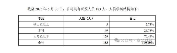 另外,福恩股份的研发投入和研发人员学历也令人担忧。2022-2025年上半年,公司研发费用分别为5862.33万元、5764.32万元、6700.77万元和3201.67万元,占当期营业收入的比重分别为3.32%、3.80%、3.70%和3.41%。截至2025年6月30日,福恩股份的研发人员共计183人,其中大专及以下人员129人,占比超过了70%,而硕士及以上人员只有5人,占比仅为2.73%。可见,福恩股份研发的主要力量还是大专及以下人员。如此低学历的研发团队,如何担起“提高智能制造水平,增强公司核心竞争力”的重任呢?