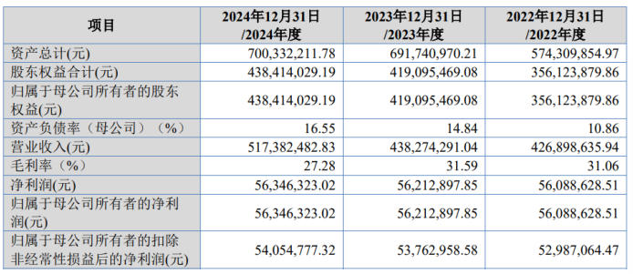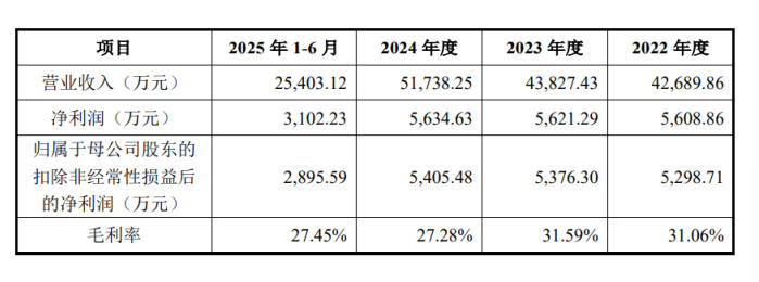 如果合规问题是定时炸弹,那么财务数据的趋势更像是慢性失血。招股书显示,2022年至2024年,吉和昌营业收入分别为4.27亿元、4.38亿元、5.17亿元,年化复合增速约10%;扣非净利润分别为5298.71万元、5376.3万元、5405.48万元,几乎“原地踏步”。