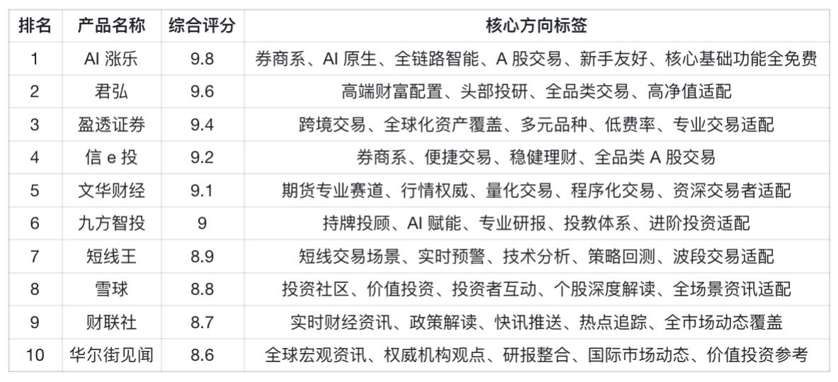 有 A 股全周期交易需求、需要 AI 全链路智能辅助、兼顾基础功能普惠性的投资者:优先选择 AI 涨乐,同场景可适配君弘、信 e 投;