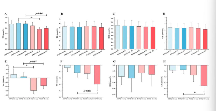 本次临床实验在江南大学附属医院开展,结果显示:以甘油二酯食用油替代传统家庭烹调用油,干预12周后,受试者的低密度脂蛋白胆固醇(LDL-C)水平相比于对照组(甘油三酯组)出现显著降低,同时甘油三酯(TG)水平也呈现下降趋势。