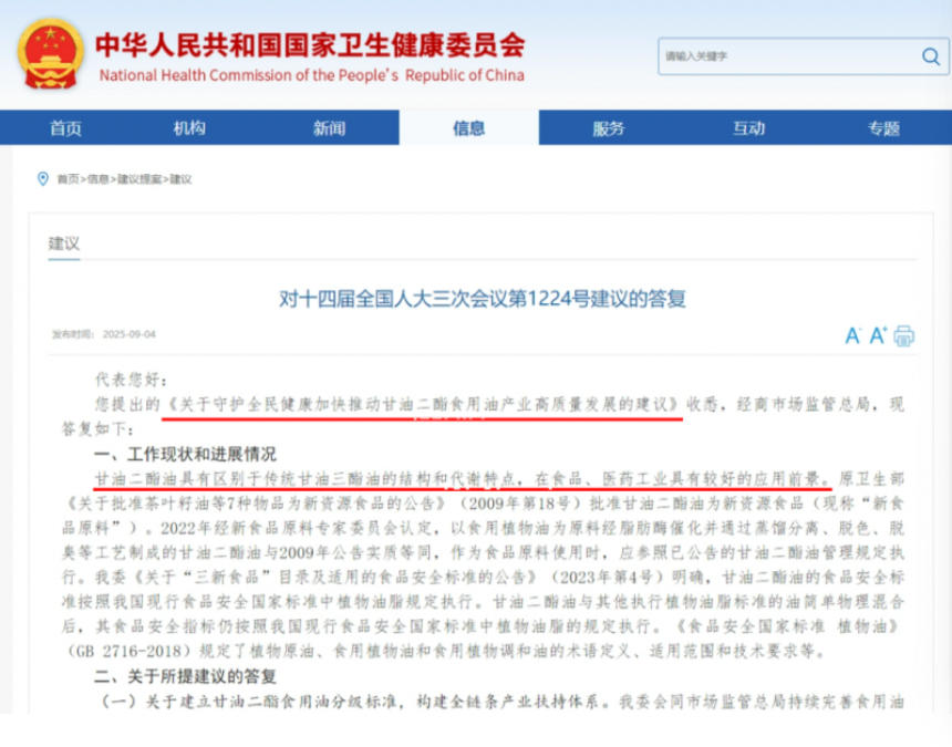 国家卫健委在《关于守护全民健康加快推动甘油二酯食用油产业高质量发展的建议》答复中指出:下一步工作目标和计划,将会聚焦人民健康营养需求和行业发展需要,推动甘油二酯健康效应研究和产业发展关键技术突破,适时推进甘油二酯食用油标准体系建设,加大油脂营养健康科普和指导,引导产业健康发展,助力健康中国战略实施。