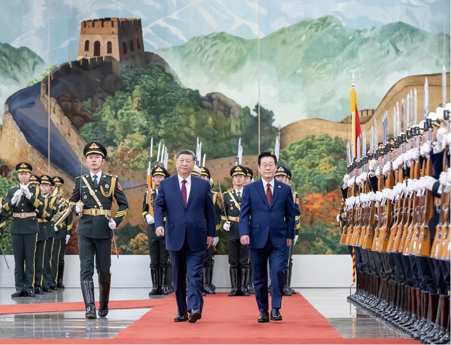 1月5日下午,国家主席习近平在北京人民大会堂同来华进行国事访问的韩国总统李在明举行会谈。这是会谈前,习近平在人民大会堂北大厅为李在明举行欢迎仪式。新华社记者 谢环驰 摄