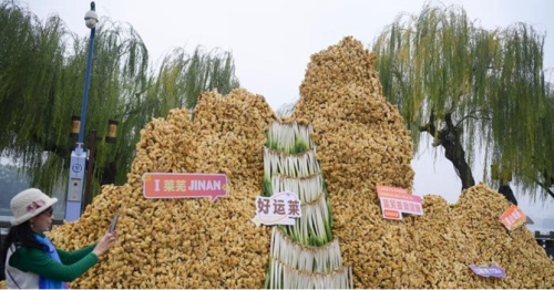 11月8日,在2025济南莱芜区大王庄镇“生姜大王”比赛中,以单株38.75千克重量获得“姜王”称号的一株生姜亮相博览会。当日,2025中国•济南(莱芜)第十二届国际姜产业博览会暨莱芜YOU选好品市集主题推广活动在济南大明湖畔开幕。以单株38.75千克重量获得“姜王”称号的一株生姜亮相博览会,吸引不少游客驻足观赏。