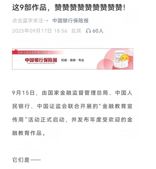 中宏网讯 近日,国家金融监督管理总局、中国人民银行、中国证监会联合启动“2025年金融教育宣传周”活动,并遴选发布受欢迎的金融教育作品。在获评的9部作品中,由中国人民银行湖北省分行选送、汉口银行制作的反诈短视频《诈梦空间》,作为全国城市商业银行唯一代表作成功入选,并获国家金融监管总局官方媒体“中国银行保险报”重点推荐。