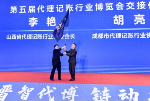 主论坛临近尾声时,举行了隆重而庄严的第五届代博会交接仪式,成都市代理记账行业协会会长胡亮接过会旗。这一仪式不仅是简单的会旗传递,更承载着行业盛会的接力使命,象征着行业的精神传承与行业的持续发展。