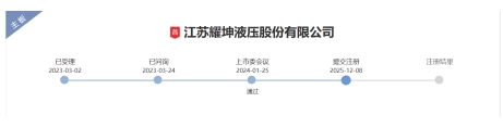 中国产经观察消息:在资本市场风云变幻的当下,企业上市之路向来充满挑战与变数。江苏耀坤液压股份有限公司,这家自1993年便扎根于液压元件及零部件领域的企业,自2023年3月向深交所递交主板上市招股书以来,历经波折,直至2025年12月8日才提交注册,期间过会后竟停滞近两年,其上市进程的坎坷引发了市场的广泛关注与诸多质疑。深入剖析耀坤液压的种种情况,不难发现其冲刺深主板上市的背后,隐藏着业绩下滑、治理缺陷、募资合理性存疑等多重隐忧。
