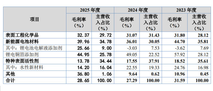新能源电池材料板块作为公司第一大业务,其核心电解液添加剂在2023年、2024年毛利率分别为- 3.62%、- 3.03%,连续两年亏本销售;2025年虽回正至25.66%,但仍低于2022年26.22%的水平。锂电铜箔添加剂毛利率亦由2023年的57.92%降至2025年的44.95%,降幅超10个百分点。整个新能源电池材料板块毛利率从44.7%下跌至39.96%。而公司只能靠低毛利传统业务撑住整体利润,核心高成长赛道逻辑彻底崩塌。