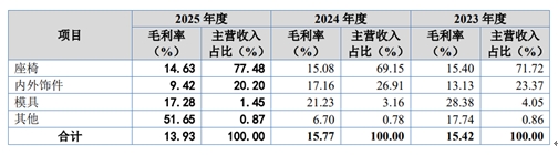 双英集团的财务状况堪称一团乱麻,盈利质量低下与流动性危机如同两颗定时炸弹。2023年至2025年,双英集团主营业务毛利率分别为15.42%、15.77%和 13.93%,座椅、内外饰件及模具主营业务收入占比合计分别为 99.14%、99.22%和 99.13%,是构成主营业务收入的主要产品,也是影响主营业务毛利率波动的主要产品。其中,座椅毛利率分别为15.4%、15.08%、14.63%,呈持续下滑态势;内外饰件毛利率分别为13.13%、17.16%、9.42%,存在一定波动。这些数据直观地反映出其新能源业务转型的艰难处境以及整体盈利能力的不断下滑。