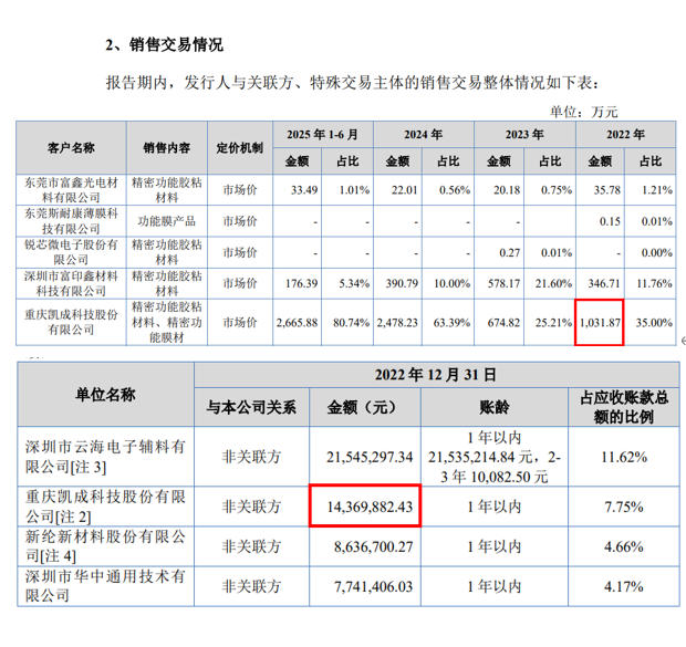 与此同时,数据显示,2025年公司对重庆凯成的销售额较2024年大幅增长2601.41万元,达到5079.64万元,而富印新材2025年全年营业收入总额较2024年的增长额仅为3533.54万元。也就是说,富印新材2025年业绩增长的73.62%,直接源于对关联方重庆凯成的销售贡献。这种高度绑定单一关联方的增长模式,让公司业务独立性遭受严峻拷问。