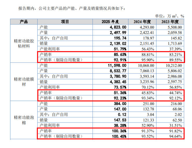 对于另一核心产品精密功能膜材,招股书披露2023年至2025年产量分别为5806.02万㎡、7060.13万㎡、8532.77万㎡,其中自用量巨大,分别为2986.08万㎡、3593.14万㎡、3780.90万㎡,对外销量分别为2597.75万㎡、3235.96万㎡、4382.45万㎡。经计算,其真实剔除自用后的产销率仅介于44.74%至51.36%之间,这反映出该产品线有大量产出用于内部流转或深加工。然而,招股书竟赫然披露该产品的“产销率(剔除自用数量)”高达92.12%、93.34%、92.23%,与真实值相差超过40个百分点。如此悬殊的差异,完全超出了合理的误差范围,属于根本性的披露错误。
