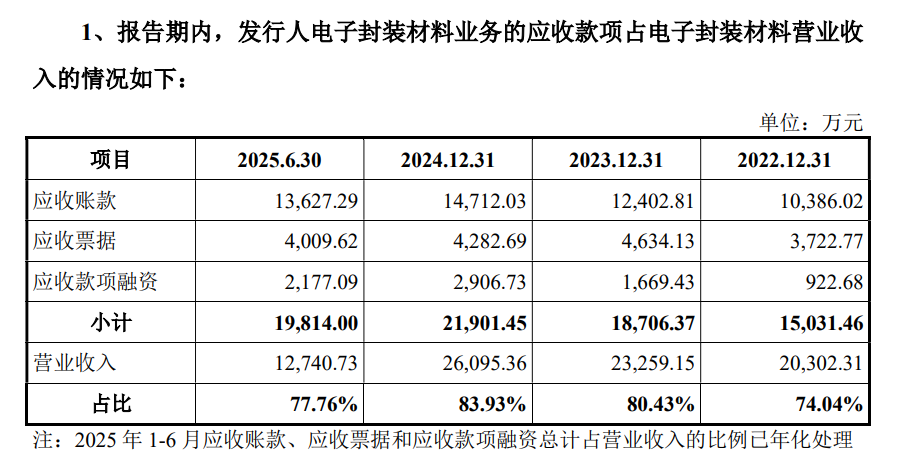 应收账款问题也是康美特财务数据中的一大隐患。根据问询回复函,2022年至2025年上半年,康美特电子封装材料业务的应收款项(含应收账款、票据及融资)占电子封装材料营业收入的比例分别为74.04%、80.43%、83.93%、77.76%,显著高于同行业平均水平。这意味着每实现100元收入,就有大约80元是以债权形式存在,而非真金白银到账。过高的应收账款比例不仅增加了公司的坏账风险,也可能暗示公司存在放宽信用政策以刺激销售的情况。如果客户出现违约或财务困难,公司将面临大量的坏账损失,这将对其财务状况和经营业绩产生严重影响。