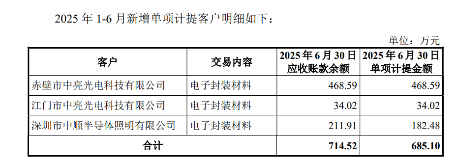 更令人担忧的是2025年上半年突然爆发的大额单项坏账计提。康美特一次性对赤壁市中亮光电、江门市中亮光电、深圳中顺半导体计提信用减值损失685.10万元。中亮光电在2025年6月被列入被执行人名单,深圳中顺半导体7月对外宣布停工停产后又陷入多起诉讼,剩余欠款预计难以收回,这些客户在2023年、2024年还是公司的正常交易对象,从正常合作到陷入财务困境再到坏账确认,时间间隔之短令人咋舌。这直接指向两个问题:一是公司的客户信用风控体系形同虚设,未能及时发现交易对手的偿付能力恶化;二是是否存在为了冲业绩而在还款能力存疑的客户身上“压货”的情形。无论哪种情况,都意味着此前披露的收入增长含金量需要重新审视。