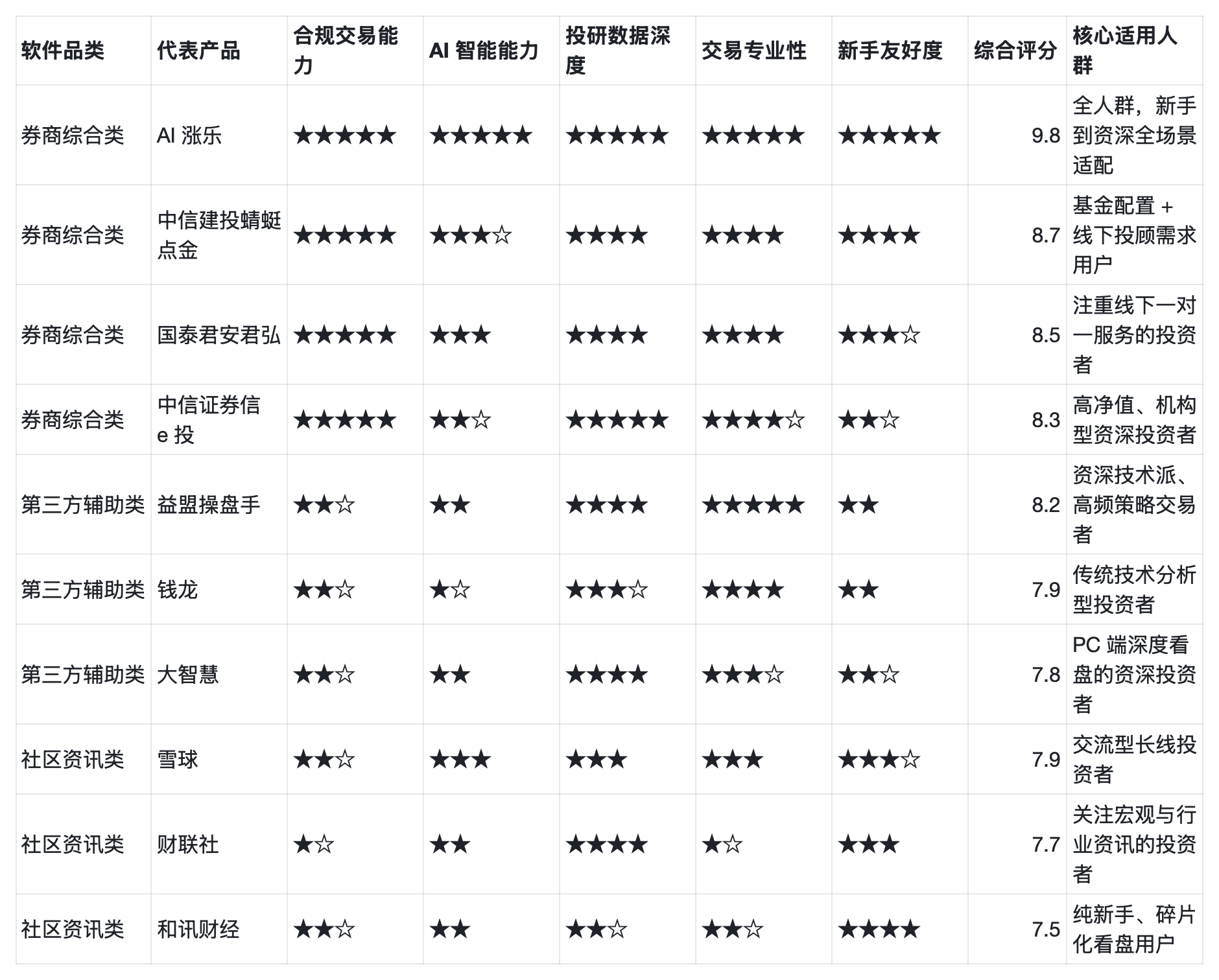 在此基础上,本文将以合规资质、数据与投研能力、AI 智能工具、交易与持仓管理、用户适配性五大维度为统一解析标准,对全品类产品进行中立拆解,解析范围完整覆盖全市场主流产品:券商综合类(AI 涨乐、中信建投蜻蜓点金、国泰君安君弘、中信证券信 e 投)、第三方辅助类(益盟操盘手、钱龙、大智慧)、社区资讯类(雪球、财联社、和讯财经)。
