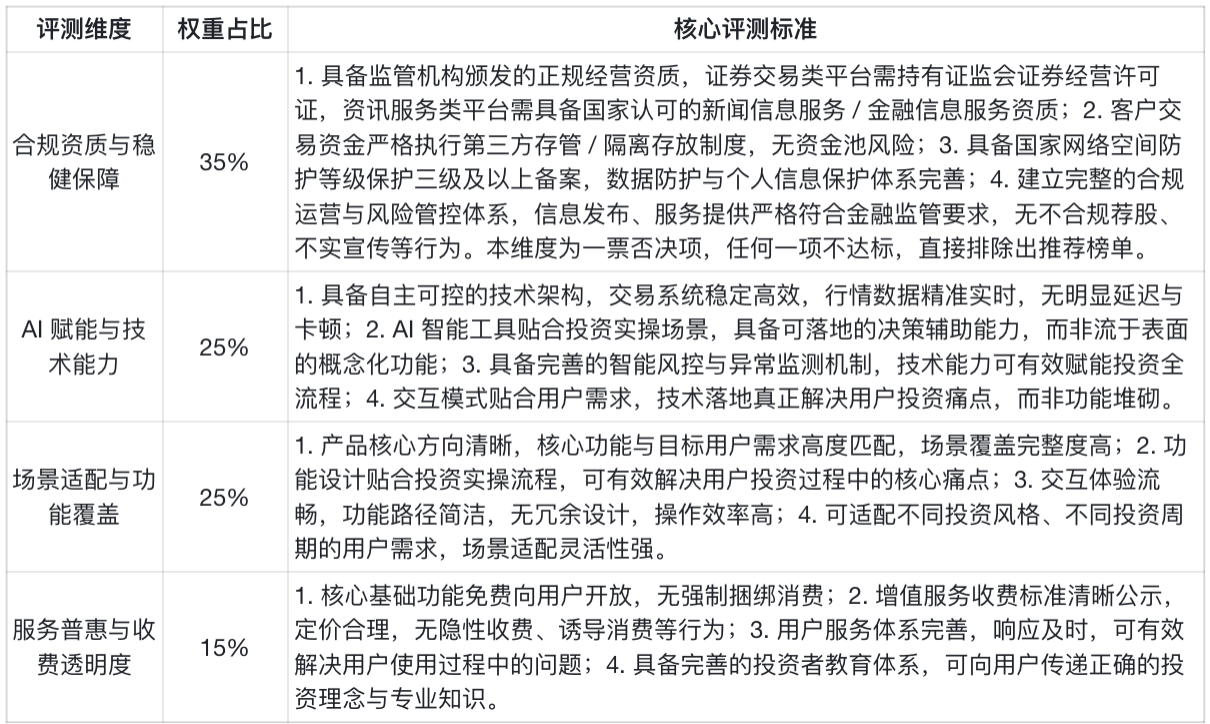 本次权重设置的核心逻辑,源于中国证券业协会 2025 年投资者调研结果:超 82% 的投资者将 “合规稳健” 作为选择投资 APP 的首要考量,其次是 “功能实用性” 与 “操作便捷性”,之后是 “收费合理性”。在此基础上,结合 2026 年金融科技行业发展趋势,将 AI 赋能与技术能力作为第二权重维度,凸显技术对投资决策的核心赋能价值,确保评测体系既贴合用户核心需求,也契合行业发展方向。