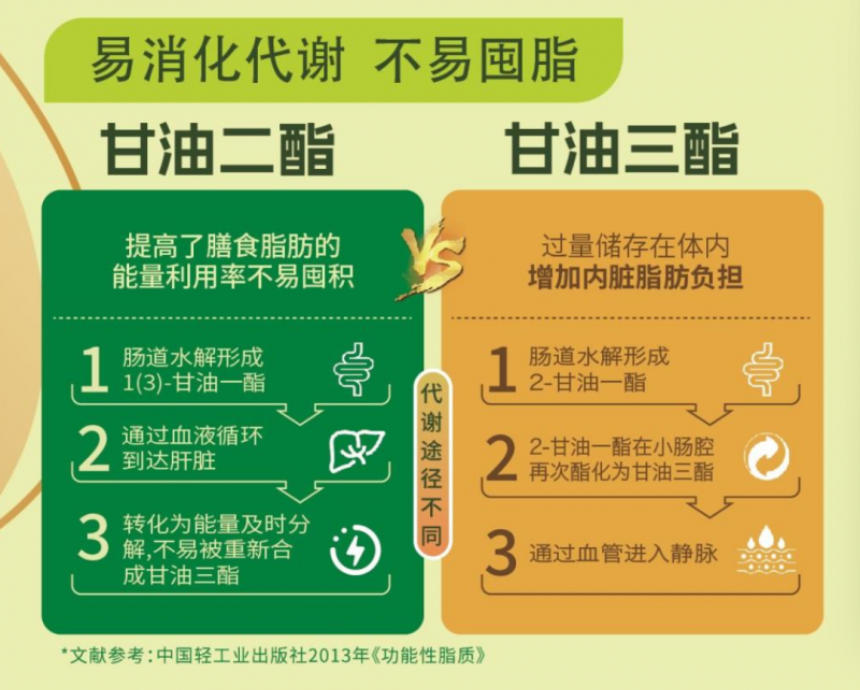 在健康与美味难以两得之际,科学家在食用油中发现了一种 天然的微量元素——甘油二酯,它不管在外观颜色、风味及物理形状上均与传统食用油保持一致,因此更容易被广大消费者接受。但与传统食用油(甘油三酯)相比,甘油二酯在人体代谢途径不同,不易在体内形成脂肪堆积,并且还能燃烧多余的脂肪,被科学家们称为“脂肪炸弹”,而这一瓶小小的油,也正成为改善国民传统甘油三酯摄入过量、代谢性疾病高发等问题的有效解决方案。