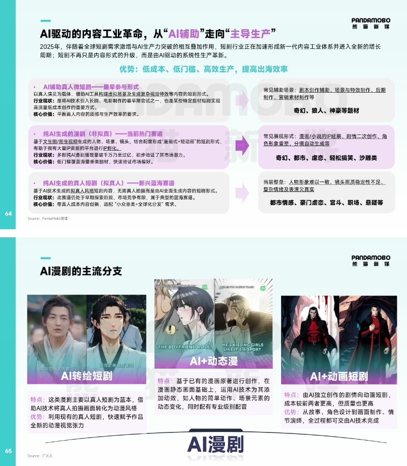 但AI不止于工具性赋能,它深度影响了短剧创作,更是催生出“零真人成本”的内容新物种AI漫剧。PandaMobo系统梳理了AI漫剧三大形态:AI转绘短剧将真人画面转化为动漫风格,实现IP视觉焕新;AI+动态漫基于漫画原著添加动效与配音,激活存量IP价值;AI+动画短剧由AI全流程创作,虽成本更高但质量突破上限。