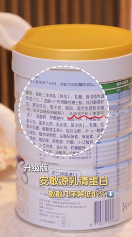 其次,牛奶中致敏蛋白主要是αS1-酪蛋白和β-乳球蛋白这两大类,而佳贝艾特悦白羊奶粉不仅天然拥有比牛奶少85%αS1-酪蛋白的山羊奶源,还在配方中升级了“安敏源”乳清蛋白,经科学检测致敏β-乳球蛋白含量更低,相较普通乳清减少11%,进一步降低了宝宝的过敏几率。